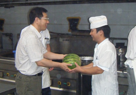 每到一地,王副校长都亲切地询问职工工作情况,叮嘱大家天气热要注意身体,并再三嘱咐后勤各部门负责人:后勤职工承担着奥运志愿者后勤服务保障工作,任务重、工作量大,大家都很辛苦,我们一定要多关心一线工作人员,尽量为他们创造良好的工作、生活条件,使他们身心愉悦地投入到奥运后勤服务保障工作。