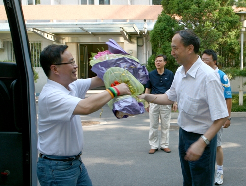 8月3日一大早,obao欧宝娱乐 迎来了盼望已久的客人----2008北京奥运会(残奥会)浙江赛会志愿者团队。学校党委副书记卢思锋一行热烈欢迎远方的客人。