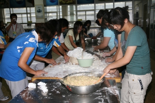 8月13日下午四点,在我校阜成路校区西区食堂二层,校团委书记吕素香、副书记陶伟老师和浙江团省委副书记、团省委权益部部长李谙及山东援奥车队负责人孙忠昌经理带领50余名浙江志愿者、30余名我校志愿者和十几位山东援奥驾驶员一起进行了“盛世奥运,美丽友谊”为主题的联谊会,并且一起包饺子。