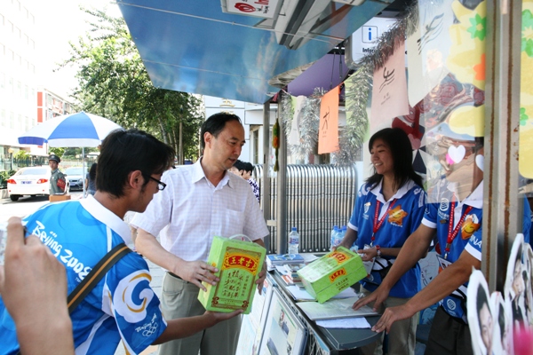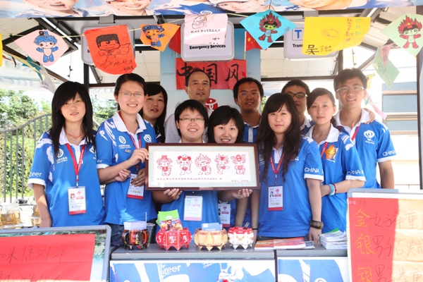 在石景山游乐园服务站点,嘉华学院的志愿者将自己亲手制作的剪纸福娃作为礼物送给了卢书记;在雕塑园服务站点,嘉华学院的志愿者还将印有“嘉华学院志愿者”字样的胸章给各位老师戴在了胸前。