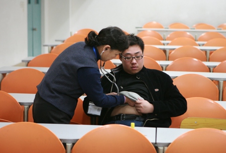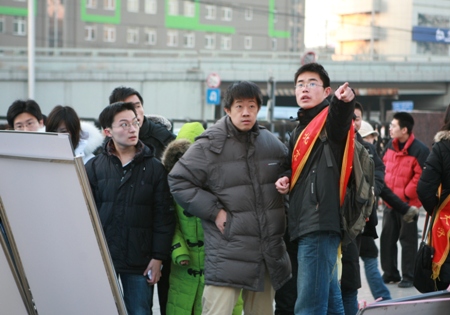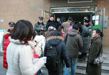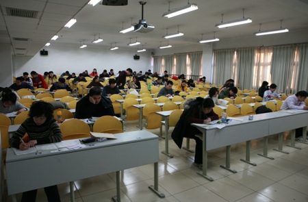 1月10日,2009年硕士研究生入学考试正式开始,我校阜成路考点一早就开始了紧张而有序地工作,所有工作人员都在开考前40分钟就位;校领导亲自到各考场现场指导工作。研究生部在考场周围挂横幅、放置温馨提示牌、考场分布示意图等,还安排了志愿者咨询服务岗,同时为考生准备了巧克力、热水,并为考生提供中午休息的场所。相关部门也积极展开工作给考生营造了一个方便、周到、轻松的考试环境。考生自觉遵守考场纪律,积极配合工作人员确保安全有序。