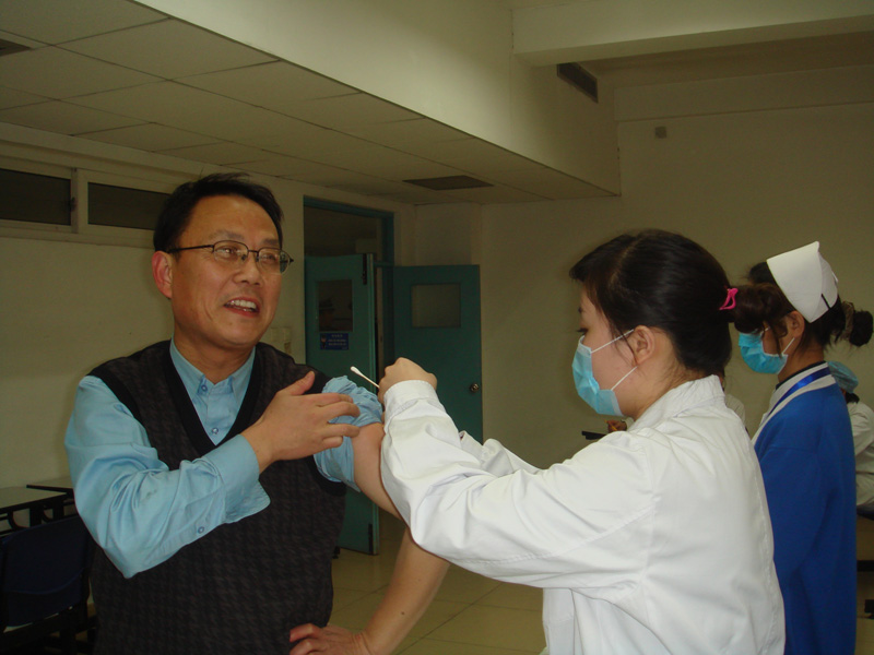 11月21日,学校甲型H1N1流感防控领导小组办公室顺利组织完成教职工接种甲型H1N1流感疫苗工作。防控工作领导小组常务副组长、副校长张耘亲临疫苗接种现场慰问解放军空军总医院的急救医生、校医院全体医护人员和各成员单位工作人员,并亲切看望了接种现场的各位离退休老同志。