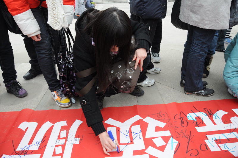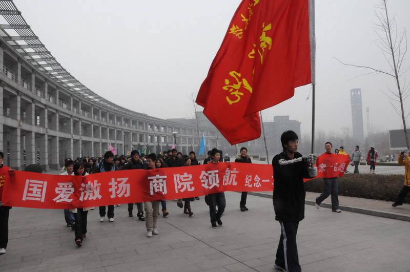 在商院火红旗帜的带领下,大一年级十五个班级的同学从下沉广场出发,沿着学校教学区的主干道慢跑起来。整齐的行进队伍中不时爆发出嘹亮的爱国口号。天气虽然格外寒冷,但同学们的情绪却异常高涨。