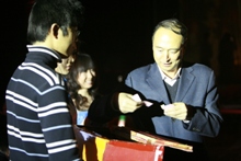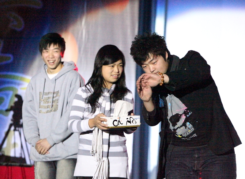 你相信有另外一个世界存在吗?你想和另一个世界的人连线吗?如果想,那么,请睁大双眼,来李其伦的魔法世界,见证奇迹发生的一刻。一张桌子,一个铃铛,会有什么发生呢? “小时候,奶奶曾给我讲故事……”李其伦神秘的语气使全场顿时安静下来, “我在另一个世界结识的朋友,如果你在,请给我一个回应,”只见原来在桌子上静止不动的铃铛在毫无外力作用的情况下突然摇晃起来。面对此情此景,场上几乎静止了两秒钟,然后爆发出各种惊叹的声音,接着是长达10秒钟的掌声,将全场气氛再次推向高潮。