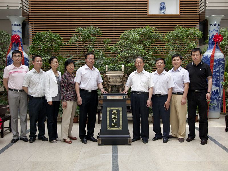 工作交流结束后,孙尧东同志和来宾在“鼎盛千秋”宝鼎前合影留念,并陪同参观学校图书馆和文科实践中心。