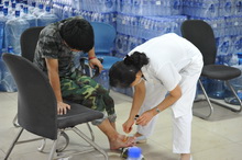 校医院副院长蔡冶详细介绍了此次军训的医务安排:“这是学校第一次校内军训,校医院对此十分重视,特意抽调阜成路、良乡两个校区的医务人员组建军训急救队,全力完成医护任务。为此,校医院做了充分的准备工作。这次医务队在开训前准备了多种医疗器械,大量药品,充足的氧气以及用以补充体力的葡萄糖,可以说医疗储备十分充分,足以应对各种突发状况。而军训急救站也是校医院为配合本次学生军训活动临时组建起来的,总共有6位医务人员,且实行轮班制。每天有四位医生留守在校医室,两位作为急救人员驻守在训练场地旁的急救站。”