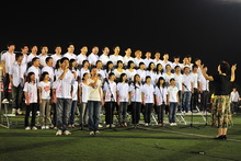 除了独唱,还有全体教官和声清唱的歌曲《精忠报国》,充满激情的指挥官挥动着双臂,当教官们浑厚低沉的嗓音响起,学生们不约而同打着拍子,还有不少同学纷纷站起身拿出手机录下这一时刻。歌曲结束后,学生们各自高喊本营的名字,全场的气氛被推向高潮。