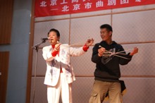 由北京市曲剧团王振声老师为同学们表演的“手上功夫”魔术将表演推向了高潮。他为同学们献上了之前仅在中央电视台表演过的他的“独家”魔术,今日同学们能够亲临现场观看表演,可谓是大饱眼福。他精湛的技艺和幽默的语言深深地吸引着同学们。他用彩色绸布、玻璃杯、扑克等最简单的道具给同学们展示了一个又一个精彩的魔术。其表演手法之快令同学们惊叹不已,场上掌声不断。有趣的相声表演,巧妙地融合了“说、学、逗、唱”四种相声的表演形式,引人入胜,让同学们在欢笑声中了解传统文化的精髓。国家一级二胡演奏演员袁迪为同学们表演了一曲二胡独奏《赛马》,演奏过后,又为同学们额外加演了一曲他自拉自唱的《草原上升起不落的太阳》,赢得了同学们的阵阵掌声。