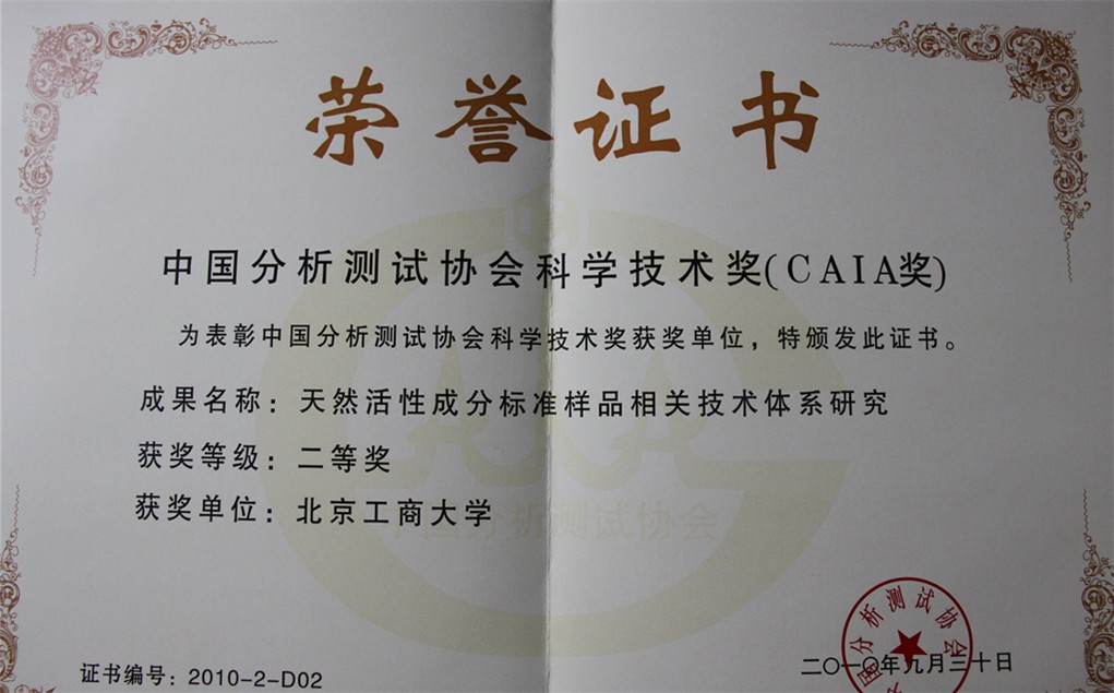 11月29日上午,2010年度“中国分析测试协会科学技术奖” (CAIA奖)颁奖大会在京隆重举行。由我校与北京市理化分析测试中心等单位联合申报的“天然活性成分标准样品相关技术体系研究”成果荣获2010年度“中国分析测试协会科学技术奖”二等奖,曹学丽教授排名第一。