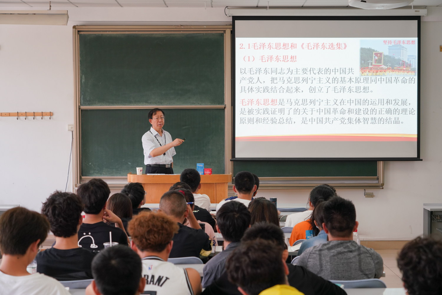 党委副书记、校长孙宝国院士用丰富的史实、大量的图片对毛泽东思想及其历史地位进行了生动的讲解,结合习近平总书记的相关论述深入分析了毛泽东的成长历程、毛泽东思想的科学内容和历史地位、毛泽东思想指导下中国革命走向胜利和社会主义现代化建设取得的巨大成就。孙宝国校长对毛泽东思想的深情讲授,打动了学子们,同学们在课后和孙校长进行了互动交流。