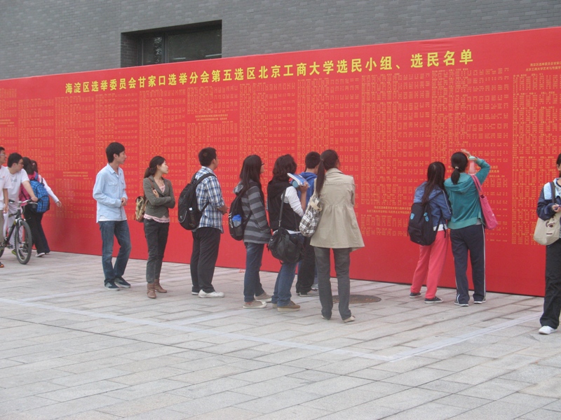 根据甘家口街道选举分会安排,自10月13日开始,海淀区人大代表换届选举工作进入公布选民名单阶段,工商大学选区严格按照计划安排准时贴出了选民榜。为方便选民察看,选区共张贴了10处选民榜,分别在工商大学良乡校区、阜成路校区东区、社区居委会(5处)、中国消费者报社、北方投资集团、白中社区。工商大学选区15421名选民被划分为334个选民小组,选民榜除公布选民名单外,同时公布了选民小组的划分和各小组召集人的名字。