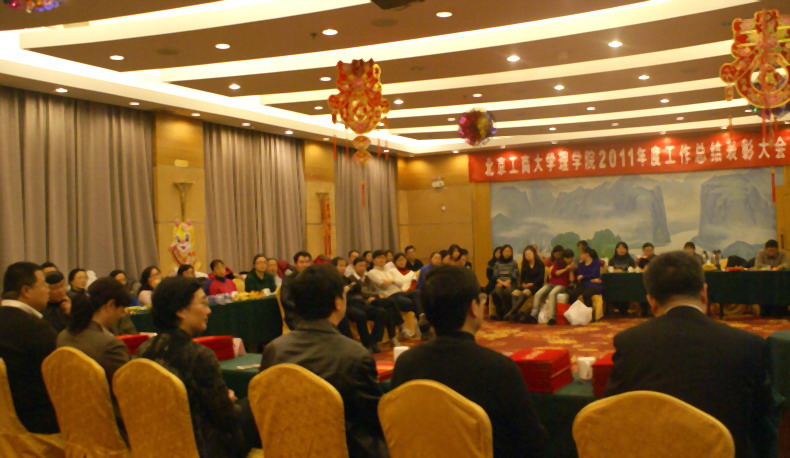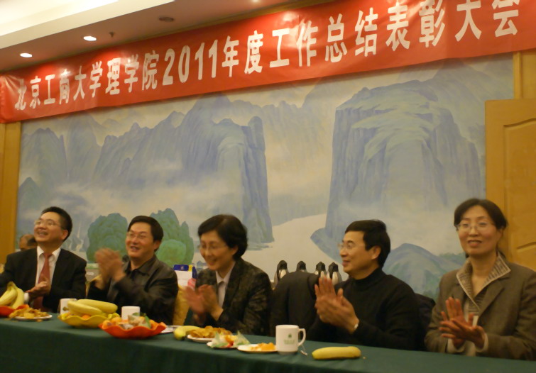 曹显兵院长在总结报告中回顾了一年来理学院在教学科研、学科建设方面所做的工作。他说,2011年理学院共完成教学工作量20303标时,科研分数15513分,折合科研工作量42972标时,完成教学科研总工作量63275标时,超工作量达25874标时;年度科研到位经费647万元,其中纵向经费268万元,横向经费379万,获批得国家自然科学基金项目6项,北京市自然科学基金2项;在学校本科教学优秀奖评选中荣获一等奖3个,二等奖5个。