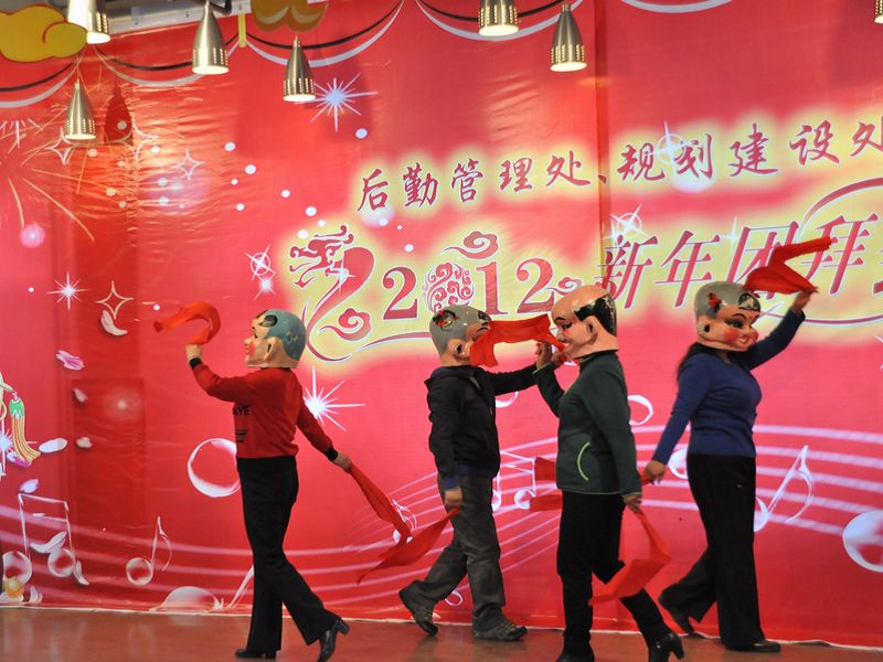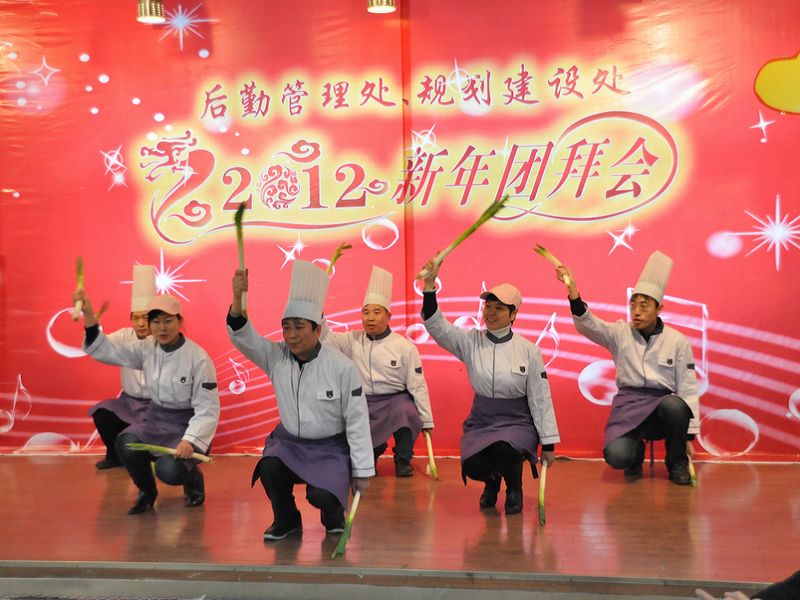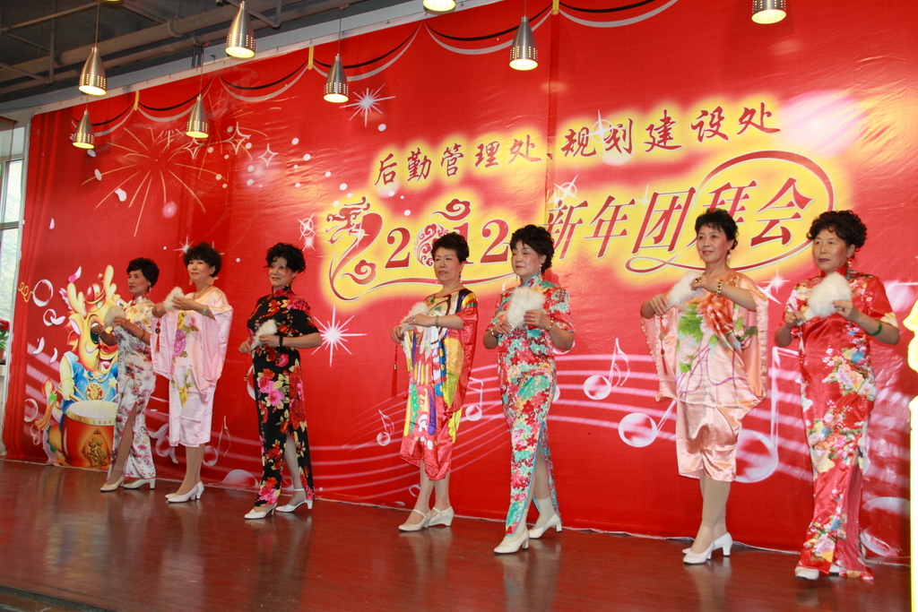 团拜会在后勤、基建中层干部的《新年好》歌声中拉开了序幕,随后,欢快的“大头娃娃”演唱的《回娘家》、优美的朝鲜族舞蹈、充满乐趣的甩葱歌、改编的表演唱《维修归来》、小品《非诚勿扰》、旗袍时装秀等接连出场,新老职工载歌载舞,赢得了阵阵热烈的掌声。最后,歌曲《走向复兴》将团拜会推向了高潮。