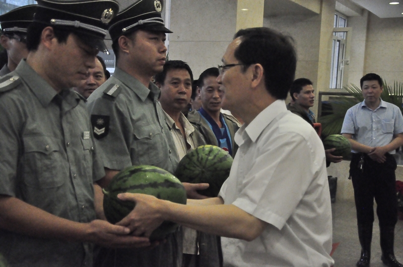 谭向勇校长代表学校党政对保卫处、后勤管理处、规划建设处及物业公司的同志们牺牲个人休息时间、坚守岗位辛勤工作表示慰问,对大家及时做好防汛工作表示由衷感谢并赠送了慰问品。谭校长表示,今年暑期北京雨水比较多,对北京的城市建设和应急系统是个考验,学校有关部门和维修人员、物业人员、保安人员、在建施工人员等及时采取措施进行应对,排除险情,保证了校园的正常运转,希望大家继续努力,做好暑期的各项工作。