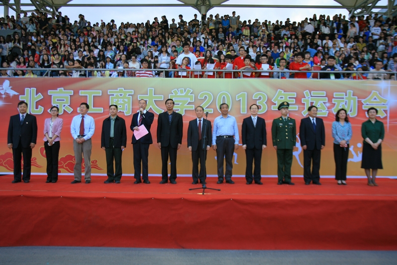 北京市大学生体育协会主席杜松彭在讲话中对我校一直以来开展的阳光体育活动给予了充分肯定。他说,北工商作为高校大学生开展体育活动最活跃的成员之一,在运动会开幕式改革上迈出了重要一步,上一届运动会表演的千人团体操美轮美奂。他还对我校配合市体协工作,承办大型比赛表示了感谢,并预祝第十一届运动会圆满成功。