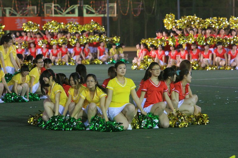 青春的节奏,让朝气蓬勃的大学生伴随着乐声在运动场上绽放出最美的年华。来自商学院、经济学院、艺术与传媒学院、计信学院以及材机学院的1008名大一女生踏着欢快的啦啦操歌曲惊现“舞台”。她们身着红色和黄色制服,高举手花,用各式各样的队形淋漓尽致地展现着“巾帼不让须眉”的气魄。长久的期盼在此刻化作了自信的笑容洋溢在每一位同学的脸上,她们用年轻人的青春蓬勃绘出了一幅又一幅壮美的画卷:“小飞机”、“2013”、“花团锦簇”不断地展现在观众的视野中。指导教师王立红说,团体操的训练让同学们都参与到了体育锻炼中,看到大家这样辛苦训练的成果在此刻展现,我们真正做到了为自己加油。