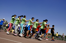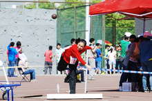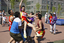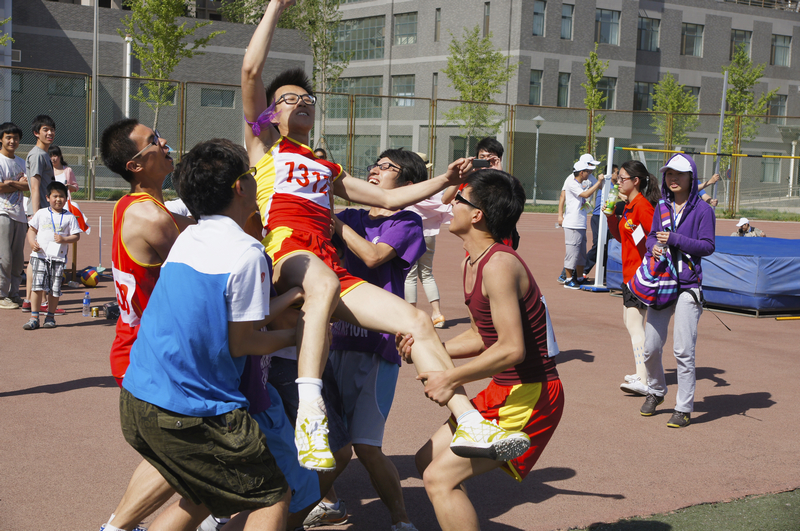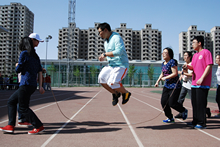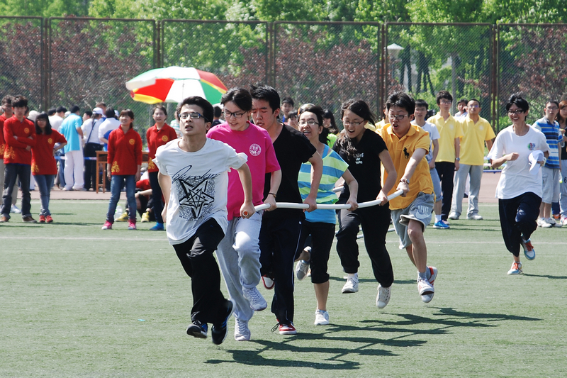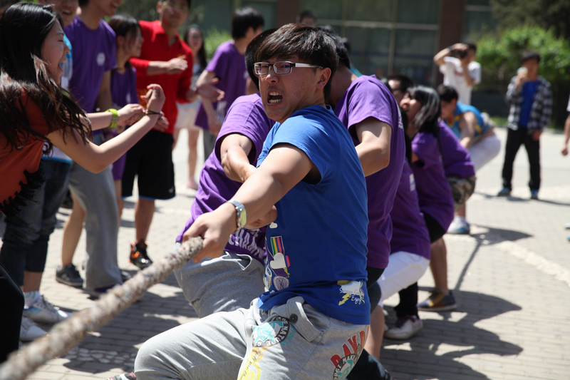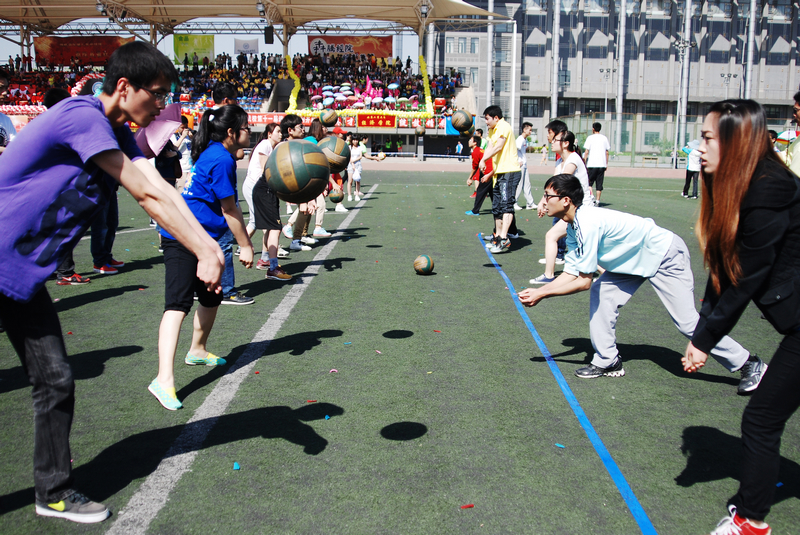 每个小组有6只“袋鼠”,手臂依次搭在前者的肩膀上蹦跳着前进。比赛还未开始,就有选手跃跃欲试,一声令下,各队“袋鼠”各自喊着整齐的口号蹦了出去,喜不自胜,欢笑不止。 “左右!左右!”伴随着队员们整齐划一的口号声,一条条彩色的队伍冲过终点,队员们身穿彩色院服,手握白色长杆,躬身快步冲向前方。在“过河搭桥”趣味项目的赛场上,加油声此起彼伏,为了使速度加快,同学们纷纷跃跃欲试的尝试新办法,有些同学甚至将鞋脱在草坪上,直接踏上了比赛所用的垫子。“五虎上将猛如虎,巾帼英雄胜须眉”,各个学院由5男5女组成的十名拔河队员,在炎炎烈日下各学院相互竞争,然而对手亦是朋友,大家不分彼此、互相鼓劲!除此之外,还有集体跳绳、排球垫球等项目更是激起学生阵阵欢笑。趣味项目相比于其他项目而言,更像是一场充满欢笑的“学院交流会”。