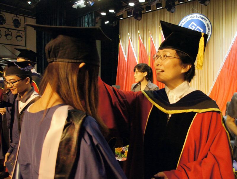校长谭向勇教授发表了热情洋溢的讲话。他向圆满完成学业的717名研究生表示热烈的祝贺,向辛勤培育学生的导师和广大研究生的亲友表示感谢。谭校长说,2013届毕业生见证了近年来我校各项事业发展的可喜变化。博士研究生招生实现“零突破”;今年研究生毕业人数创新高,同比增长21.7%;研究生实现二级管理平稳过渡;科研经费超过1.5亿元,科研基础条件显著改善;学术活动水平提升;科研成果丰硕……广大研究生既是这些变化的见证者,也是参与者、受益者。谭校长对全体毕业生提出三点希望并期望大家有所思考,有所提高。一是学会说话。说话首先要准确,要对事情的来龙去脉有定性判断、定量分析,要基于思考、富于哲理、生动幽默,不说假话,不说破坏性的话。二是学会写字。不论在何种岗位工作,都要练就扎实的写作功底,确保文字经得起检验。三是学会做事。刚走出校门的研究生要摆正自己的位置,从小事做起,从基础做起,做事认真负责,明确目标,遵守程序,将来才能把大事办好。谭校长希望到百年校庆日,打开同学们的心愿瓶时,同学们都能成为在各个领域对国家、对民族、对社会、对学校有重大贡献的人才!谭校长的讲话贴切而又实际,话里流露着对全体毕业生的殷切期望,充满了力量,深深感染了在座的毕业生们。