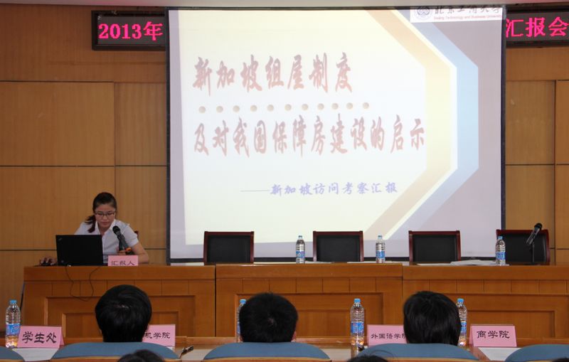 研究生和本科生分别汇报海外交流学习情况。首先由研究生赴新加坡学术交流团进行成果汇报。来自经济学院金融专业的学生代表张娜和来自食品学院食品科学专业的韩帅分别从不同的专业角度介绍了新加坡独具特色的住房保障制度和新加坡完善规范的科技创新体系,分享了他们在新加坡的所见、所闻和所感。