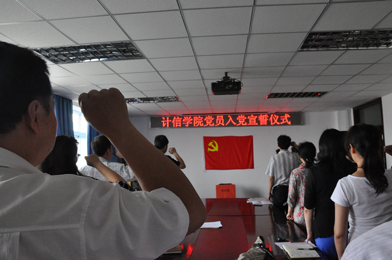 同日,蔡强院长主持举行入党宣誓仪式。今年六月计信学院共有3名教师预备党员转正,学院部分教工党员参加了他们的入党宣誓仪式。老党员与新党员一起宣誓,重温入党誓词,共同回忆党走过的92载峥嵘岁月。熟悉的誓词引发了教师们的思考。薛红教授作为新党员代表发言,她说:“成为了一名党员真的很开心,今后将更加积极地工作,虽然年纪大了,但仍然会以一个新党员的身份严格要求自己,努力向大家学习。”老党员张晓力老师表示:“我们在重温誓词时会问自己,有没有真正地履行党员义务,有没有真正做到积极工作,这促使我们反思与进步。” 入党积极分子青年教师祝晓斌表示:“今天的宣誓仪式很神圣,今后一定要向老党员学习,积极上进,努力工作。” 党总支书记陈谊对三位新党员表示了祝贺,然后勉励在场的全体党员和积极分子:要继续发扬党的优良传统,在学院的各项工作中发挥模范带头作用,发挥正能量,为学院的发展做贡献。