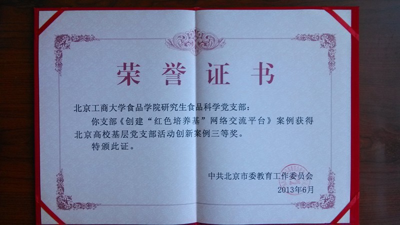 在日前召开的北京高校纪念中国共产党成立92周年座谈会上,表彰了北京高校党支部活动创新案例,我校食品学院研究生食品科学党支部《创建“红色培养基”网络交流平台》案例获北京高校基层党支部活动创新案例三等奖。