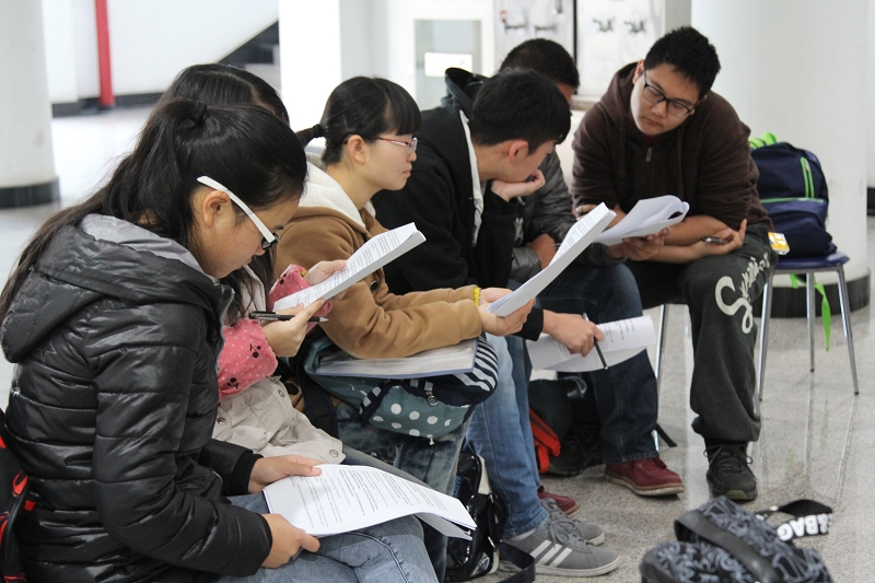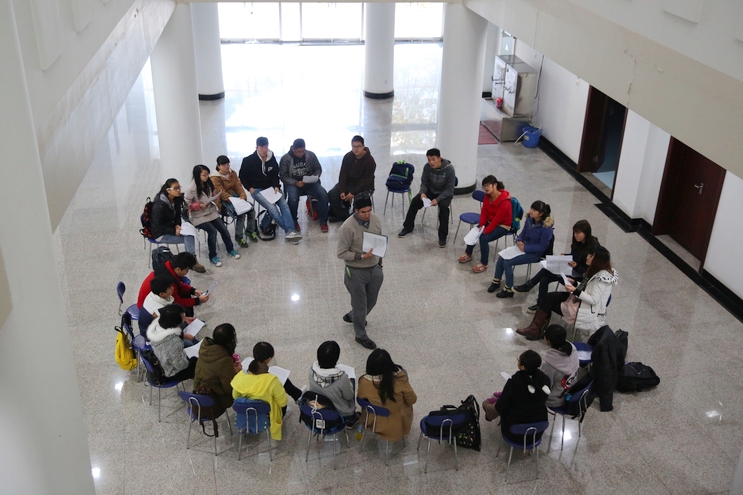 周一清晨7:15,距离上午第一节课还有1个多小时,文三楼一层的大厅里,来自各学院的几十名学生,在外教Mervyn的带领下围坐成一圈,认真地大声朗读和排练着手中的英文剧本。Mervyn不时地纠正学生的发音或语调,并指导学生说话时加入感情和语气。每位学生都聚精会神地看着手中的剧本,在Mervyn细心的指导下,投入地扮演着自己的角色。剧本排练结束后,学生们凑上前围坐在Mervyn旁边,用英文向他提问,他耐心地回答着学生问题,并带领学生一遍一遍地练习正确的发音。这是外国语学院澳大利亚籍外教Prince Mervyn James Edwards老师为本科生举办的英语角,也是外国语学院公共英语延续教学活动的一种形式。
