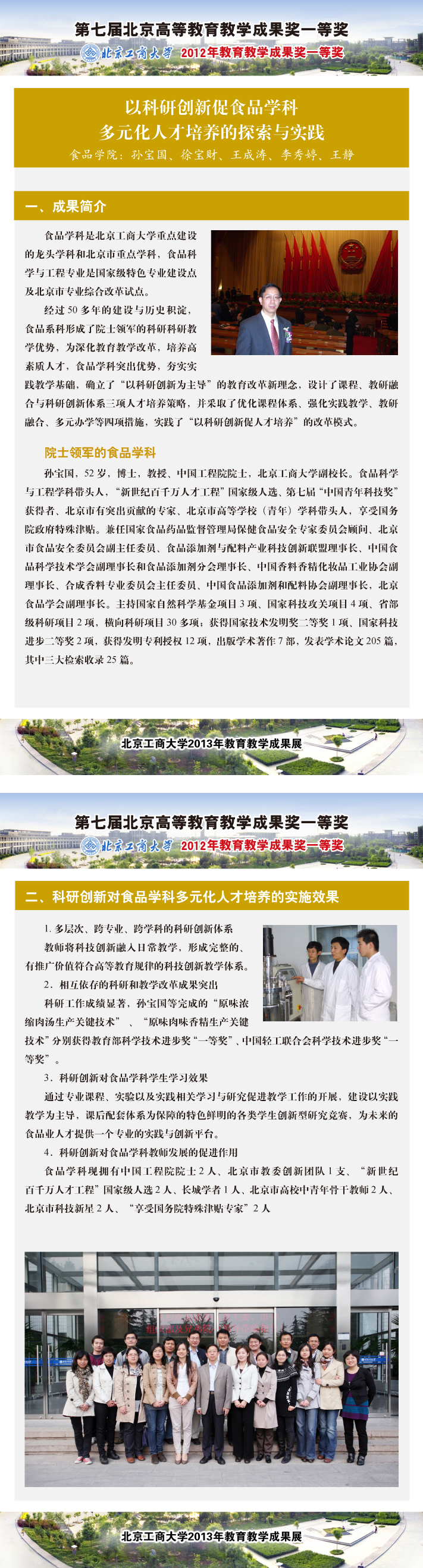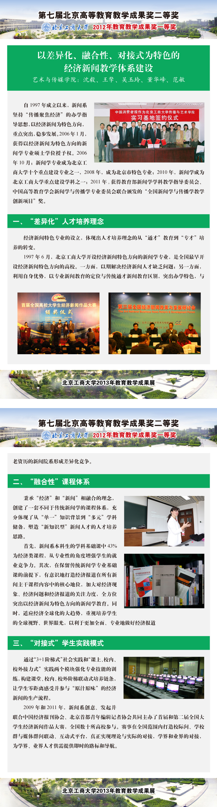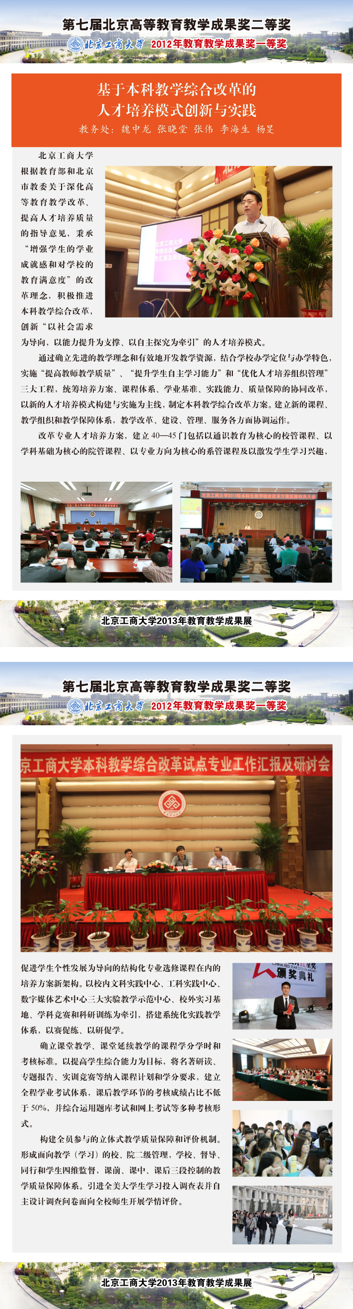日前,《北京市教育委员会、北京市人力资源和社会保障局、北京市财政局关于表彰北京市教育教学成果奖的决定》(京教人〔2013〕18号)发布。在第七届北京市高等教育教学成果奖评选活动中,我校共有5项成果荣获一等奖、9项成果荣获二等奖。根据北京市教委有关文件精神,为了更好地展示和宣传我校教育教学和人才培养成果,总结本科教育教学经验,营造良好的教学工作氛围,学校举办2013年教育教学成果展,现进行网上展示。