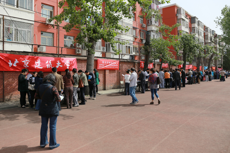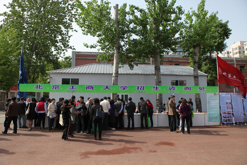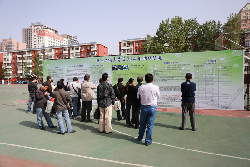 2014年招生简况”的巨幅展板矗立在体育场中央,介绍了招生计划、领导寄语、2014在京招生主要变化的内容、国际合作学生项目等情况,不少家长、学生驻足观看,并拿着纸笔进行记录。