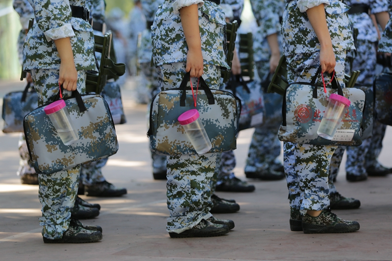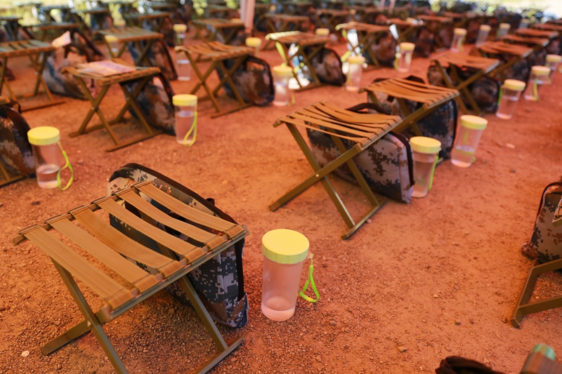 训练场上,太空杯整齐的排列在马扎的旁边。一到休息时间,军训新生们便每人手提着一只相同款式、颜色各异的太空杯来到接水处,排着整齐的队伍接水、喝水。小小太空杯起到了大作用。