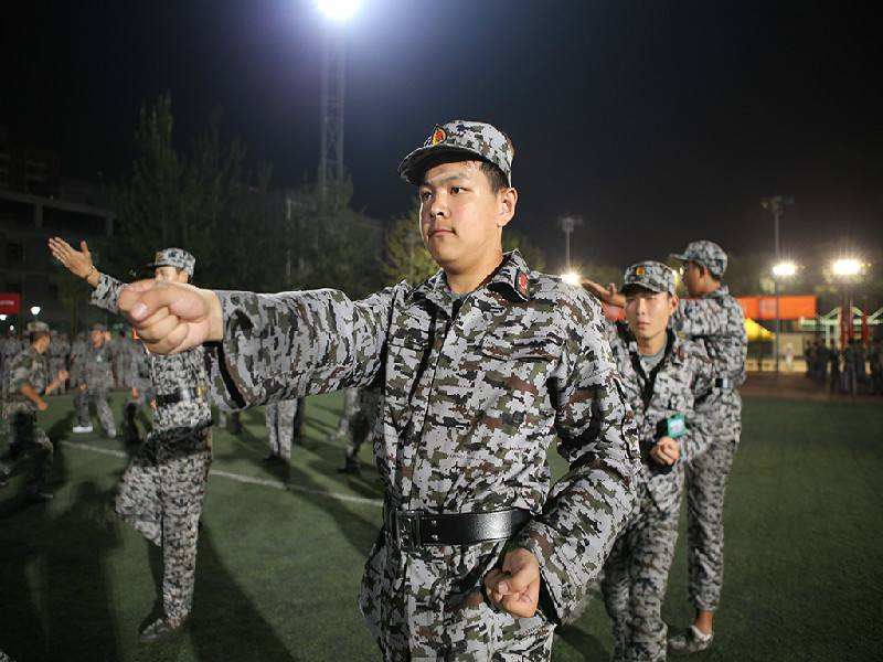嘹亮的口号,笔直的军姿,整齐的步伐,训练场上,尽管凉风习习,学员们却还是挥汗如雨,六营的军训活动正在行政楼西侧的场地上如火如荼的开展着。除了军训的基本项目,今天的训练内容仍旧是以正步为主的三大步伐训练。“向左转!”“向右转!”响亮而干脆的靠脚声穿过训练场,激荡在每一个人的耳中。“跑步走!”“正步走!”队伍雄壮的脚步声,让人精神振奋。晚上的表演科目训练与前几天相比也更上一层楼,学员们不仅能熟练地掌握动作,而且整个队伍动作整齐,磅礴的气势震撼了在场的所有人。