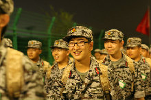 晚上七点二十分,全校参加军训的学生在教学区操场集合完毕,为让14级新生严格要求自己,学校特意播放了13级学生的汇报演出,同学们看的津津有味,回味无穷。此次拉练首次男女分开,女生4.5公里,男生6公里,许多同学都是第一次参加拉练活动,感觉十分新奇,放眼望去,仿若一条迷彩长龙,每个同学都背着鼓鼓的行囊。“虽然感觉有点累,但是也很有趣,因为大家在一起的缘故,我很开心。”女生二十二连五班的岳馨毅这样说。“我们在部队拉练的时候也是这样的,大家开开心心的聊聊天,感觉不到有多累。”二十三连的教官也说道。一路上大家唱着一首一首的军歌,脸上伴着欢乐的笑容,荡漾着青春的旋律。