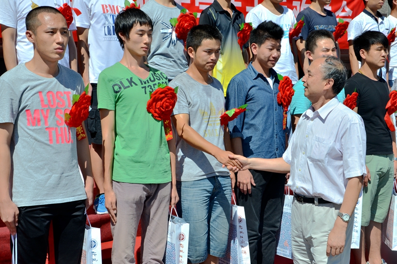 38名学生入伍的决定》,并对他们给予厚望。新生代表为入伍的学生佩戴红花,鲜艳的红花别在胸前,代表着无上的光荣,凝聚着母校对全体入伍学生的关爱与期许。各学院党总支副书记代表学校为入伍学生赠送了纪念品。