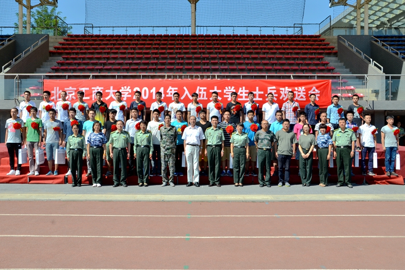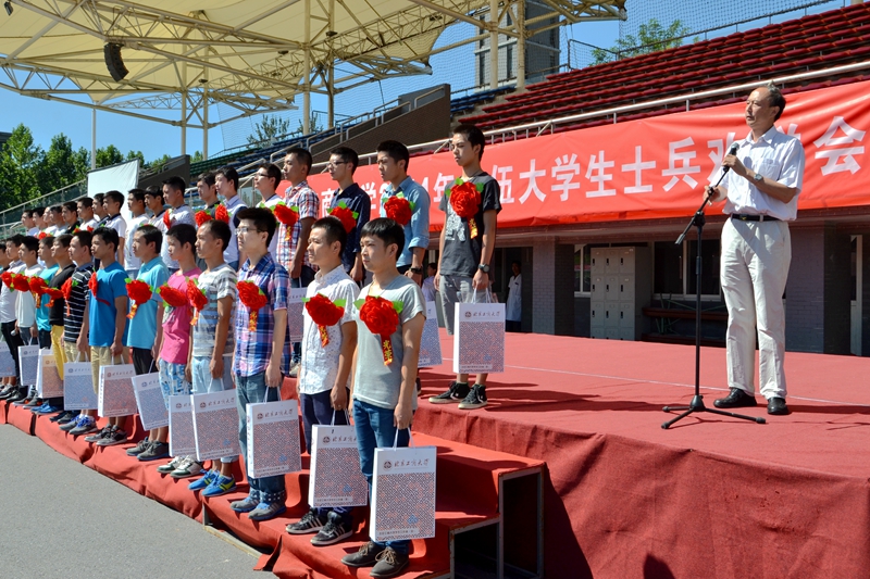 9月3日,秋高气爽,阳光灿烂,学校2014年入伍大学生士兵欢送会在良乡校区体育场举行。党委副书记、军训总指挥卢思锋,西城区武装部夏卫东副部长出席活动,各学院党总支副书记、辅导员、38名新入伍学生及全体2014级新生参加活动。欢送会由军训团政委、学生处处长吕素香主持。