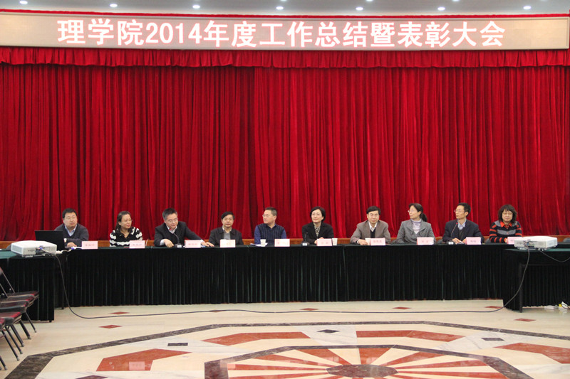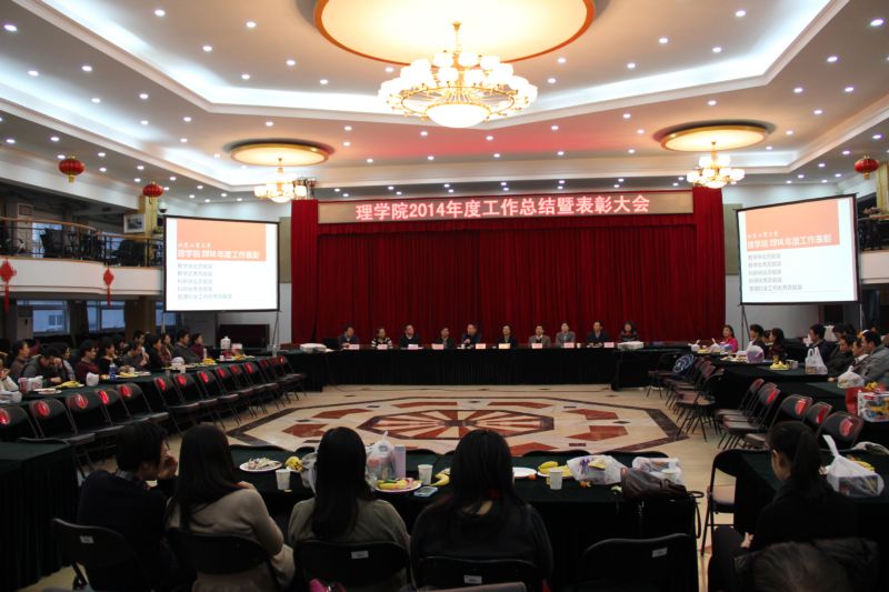 1月8日,理学院召开了2014年度总结表彰大会,总结2014年理学院的工作和取得的成绩,表彰在教学和科研及社会工作方面做出突出贡献的教师和集体,部署2015年工作。学校副校长李朝鲜、副校长张耘出席会议并讲话。学校科技处处长杨有红、人事处处长张晓堂、工会常务副主席田宏出席、学院领导班子成员及全体教职工参加会议。大会由党总支书记祝钧主持。