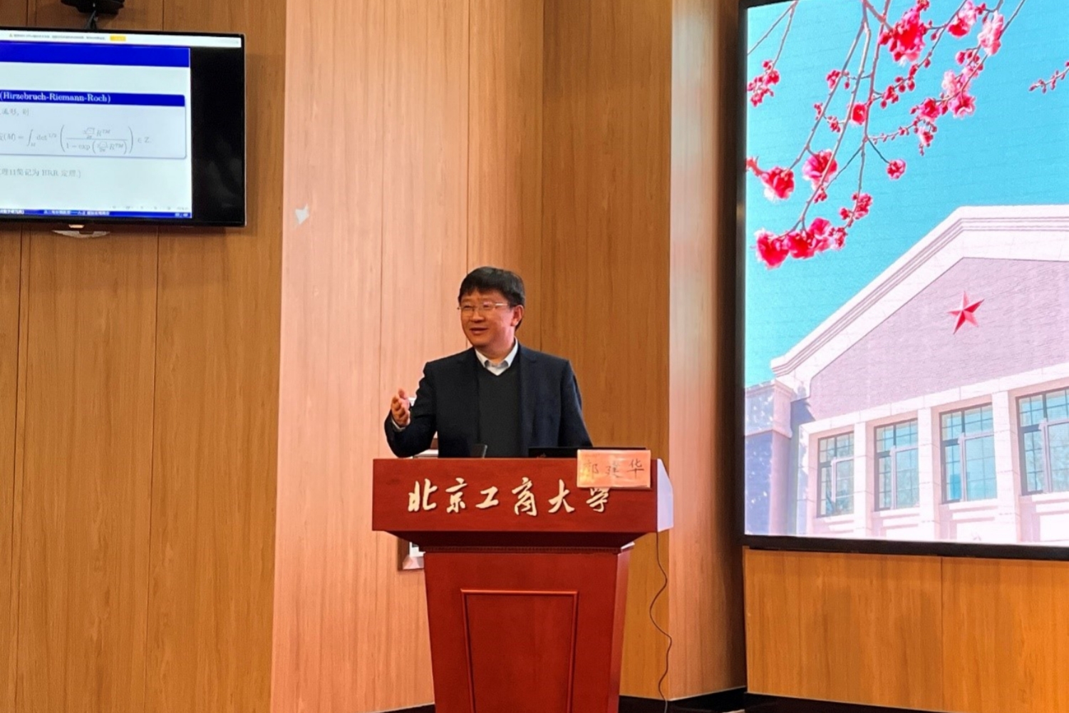 11月7日,著名数学家、南开大学教授张伟平院士应邀莅临我校并作题为“从三角形到流形——Atiyah-Singer指标定理简介”的学术报告,报告会在阜成路校区举行。学校党委副书记、校长郭建华教授出席报告会并讲话,数学与统计学院部分师生参加了本次报告会。报告会由数学与统计学院执行院长曹显兵教授主持。