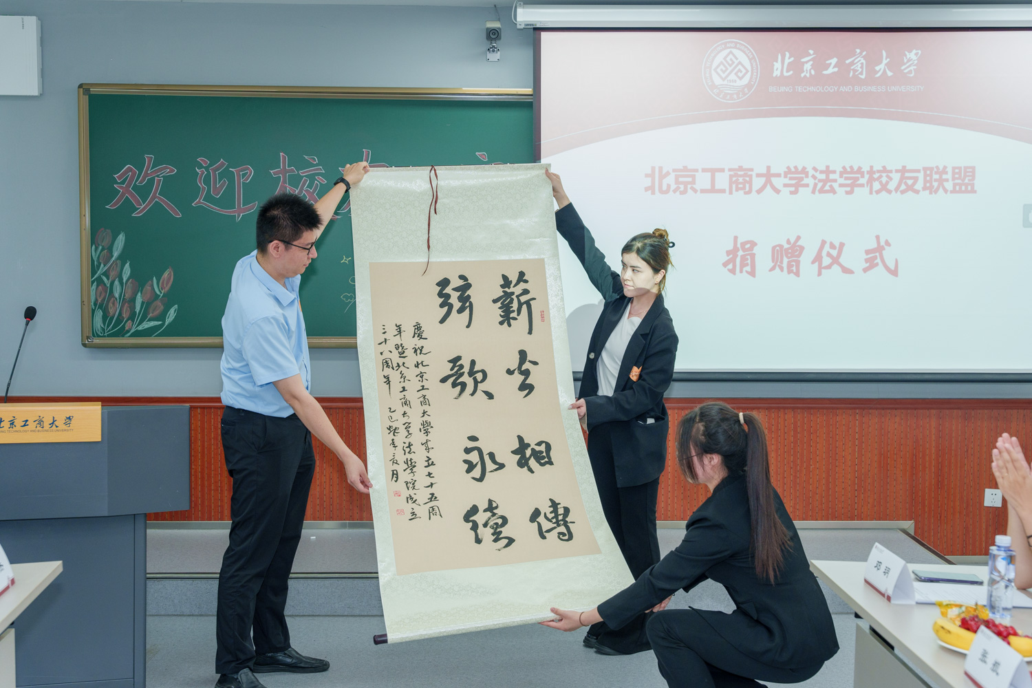 会上,北京浩略律师事务所创始人、执行主任孙统彪向法学院捐赠法学教育基金,助力法学教育事业的薪火相传。副会长张法水为母校献上了一副精心创作的书法作品。参会师生深情回顾求学岁月和师生情谊,大家畅叙情谊、共谋发展,现场气氛热烈而温馨。
