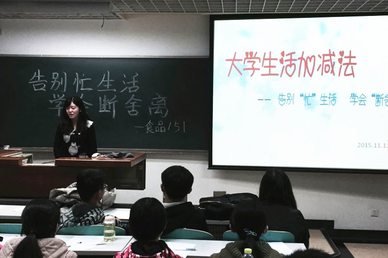 环境151班班主任冯旭东教授从食品学院的2014-2015学年学业分析入手,介绍了“断舍离”概念的精髓:断=不买、不收取不需要的东西;舍=处理掉堆放在家里没用的东西;离=舍弃对物质的迷恋,让自己处于宽敞舒适,自由自在的空间,希望同学们把“断舍离”学习到的东西运用到生活和学习中。食品15(中外)班主任徐虹副教授每周日晚到良乡督促学生晚自习,并与学生深入交谈。她组织班级学生从“时间都去哪儿了”、“我的大学理想”、“时间表与理想清单”三个方面提醒同学们“社团活动”不宜贪多,她让同学们将自己的时间规划罗列出来,并与自己的理想对照,从而发现自己的不足,在以后的学习生活中保持兢兢业业的态度,百尺竿头更进一步,同时她还为同学们详细解读了《关于进一步加强学校社团管理及新生社会工作引导的意见》。食品151班在班主任王蓓副教授的带领下,举行了“告别忙生活,学会断舍离”的主题班会,分享自己的大学的理想,并让大家在小组班级内分享,王蓓副教授仔细询问大家闲暇时间是如何度过的,并鼓励大家合理安排社会工作和学习的关系。应化152班班主任黄泉明副教授别出心裁,以化学元素为抽签对象,将学生分组,进行课余生活、大学的理想及以后的出路讨论,帮助学生从庞杂的学习生活中厘清思路,学会选择。生物151班班主任王友升教授从开学至今共召开班会、班干会10余次;多位班主任到良乡督促学生晚自习工作、检查学生白天出勤情况。
