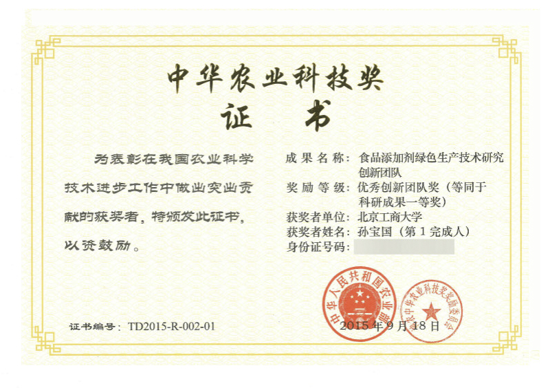 近日,由我校校长孙宝国带领的“食品添加剂绿色生产技术研究创新团队”荣获农业部中华农业科技奖一等奖(等同于科研成果一等奖)。该奖项设立于2006年,经农业部同意、科技部批准,中国农学会设立,在促进农业科技发展、推动行业科技进步中起到激励和导向作用,重点奖励为我国农业科学技术进步和创新做出突出贡献的集体和个人。我校获奖的团队成员有孙宝国、李秀婷、曹雁平、宋焕禄、徐宝财、王成涛、郑福平、王静、杨贞耐、张敏、田红玉、谢建春、陈存社、刘玉平、陈海涛、韩富、辛秀兰、廖永红、黄明泉、王凤寰等。