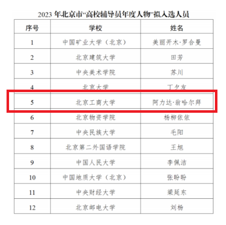 市委教育工委组织主办的2023年北京市“最美高校辅导员”系列荣誉推选展示活动顺利举行。我校少数民族专职辅导员阿力达·翁哈尔拜获北京市“高校辅导员年度人物”荣誉称号。北京市“最美高校辅导员”系列荣誉推选展示活动是面向北京高校辅导员举办的重要评选活动,旨在全面实施“时代新人铸魂工程”,选树新时代北京高校辅导员先进榜样。