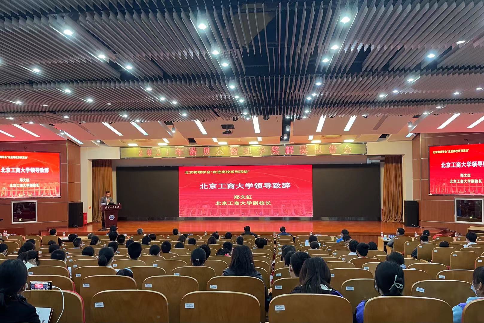 郑文红代表学校致欢迎辞,在致辞中回顾了我校的发展历程、介绍了学校目前的学科结构和招生规模。他指出,物理学科作为最重要的基础学科,为科技革命提供源头性共给,为建设创新型国家、培养创新型人才提支持。学校通过教学综合改革,充分发挥物理学科基础作用,致力于打造、培养创新人才,为社会发展作出北工商贡献。北京物理学会走进北工商,诺贝尔物理学奖解读报告会在我校举办,将为我校广大师生提供走近前沿科学成果的宝贵机会,对学生科学素养的提高和科学精神的培养有着推动作用,也为展示我校的发展成果、提升我校影响力提供了契机。