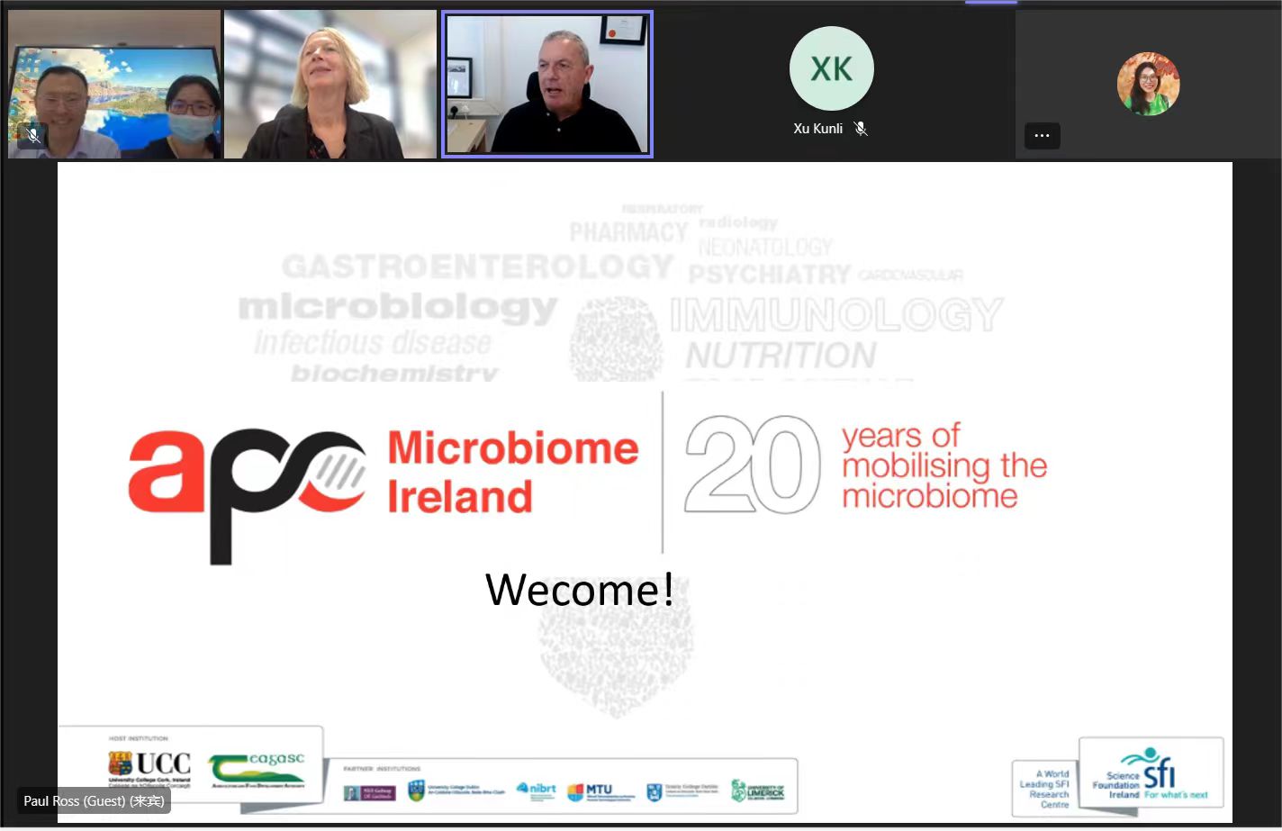 近日,爱尔兰国家APC微生物组研究所(APC Microbiome Ireland, 简称APC)、爱尔兰农业部农业与食品发展局(Teagasc)与obao欧宝娱乐 食品与健康学院进行了线上合作交流。此次会议APC负责人、爱尔兰皇家科学院院士、爱尔兰科克大学保罗·罗斯(Paul Ross)教授及Teagasc负责人、爱尔兰皇家科学院院士、爱尔兰科克大学凯瑟琳·斯坦顿(Catherine Stanton)教授参会,学院院长王彦波教授、副院长王蓓教授以及孟繁宇博士参加了本次合作交流会。