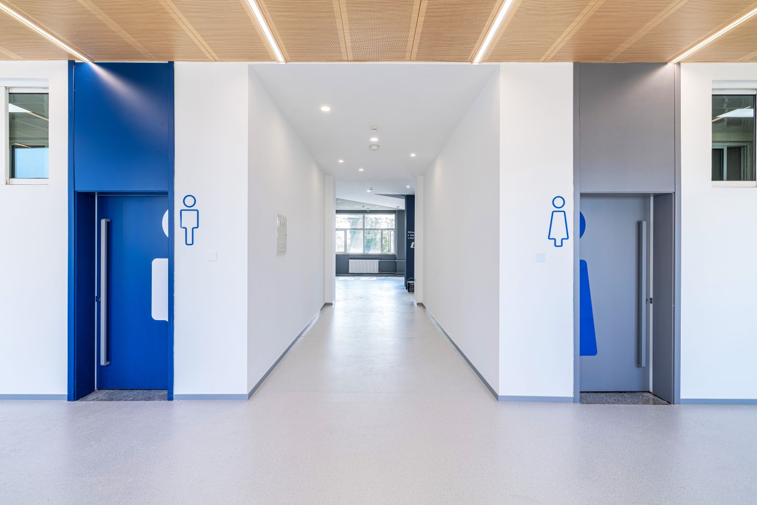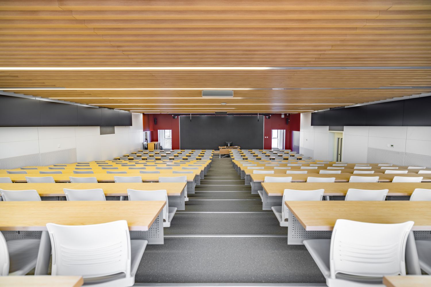 文二楼二、三层的精品教室以木色为主题色,并在家具上点缀楼层主题色,使教室内与公共空间呼应结合。四层的特色学科教室则按照各学科院色区分,使学生对所在的学习环境及学科专业产生归属感。四层新工科阶梯教室则采用食品与健康学院绿色;新商科阶梯教室的主题色采用商学院的红色;艺术类阶梯教室主题色采用传媒与设计学院的蓝色。