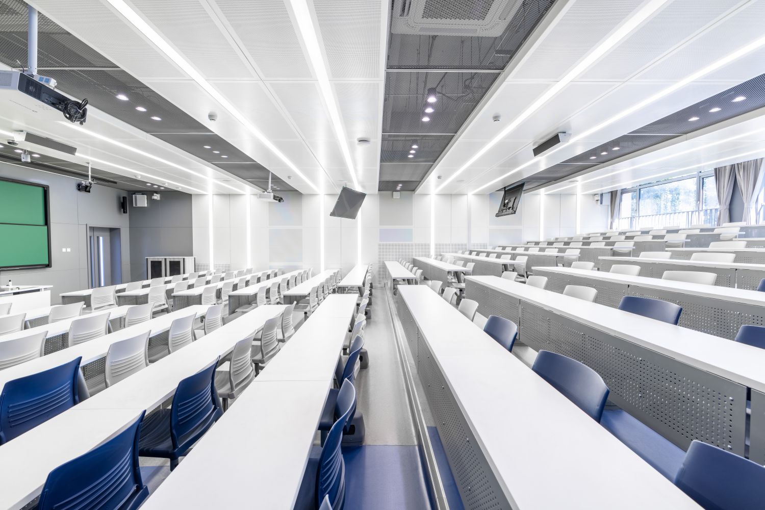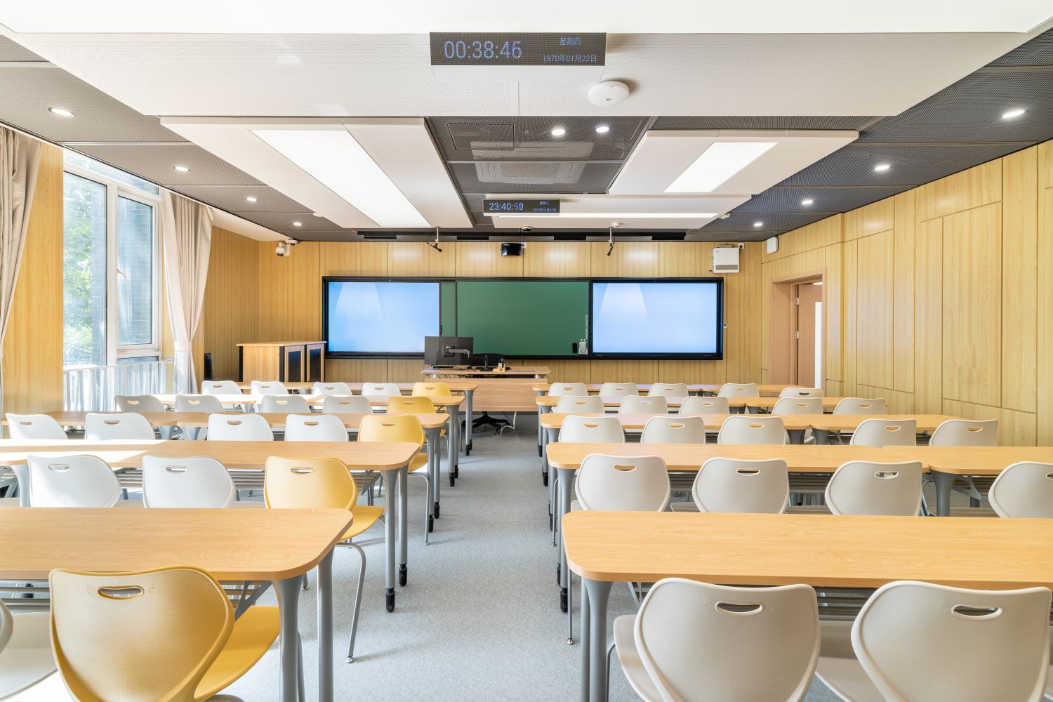 新建智慧教室登录腾讯便可调用教室内摄像头,跟踪教师走动位置,便于线上学生观看教师授课、板书及互动,实现了线上线下混合式教学;提供了大屏、记忆黑板、电子白板、玻璃白板、实物展台等多种书写方式,每间教室黑板多层可推拉,大大增加了书写面积,实现了自由自主、随心便捷的书写模式;考虑到大教室幕布遮挡黑板的情形,中控面板首页设置了一键幕布升降功能,教师可随手调整幕布升降,免去了遮挡困扰;设置多种扩声模式,“一师一麦”、“一室一麦”,辅助吊麦,手持买和吊麦在不同区域讲话自动切换,教师即使未携带任何扩声设备,也不用担心授课扩声问题;电子时钟双面显示,无论教师还是学生微微抬头便可轻松观看时间;教室内教师机显示器采用大屏超薄配置,可触控、可书写,自带隐藏式摄像头,360度可旋转,便利教师教学;教室内使用U盘录制的课堂实录,下课拔走即带走,无需手动下载;教师讲台可升降,配有无尘膜衣粉笔、硬质粉笔、软质粉笔、喷水板擦、干湿两用板擦、电子教鞭、眼镜收纳,讲台边配有水杯托、衣帽钩,学生桌椅也配有桌斗,方便师生放置个人物品。类似的人性化设计细节还有很多,教务处始终秉持教学服务没有止境的理念,用心设计和处理每一处细节,也将在后续教学过程中不断听取师生的使用意见反馈,积累完善,精益求精。