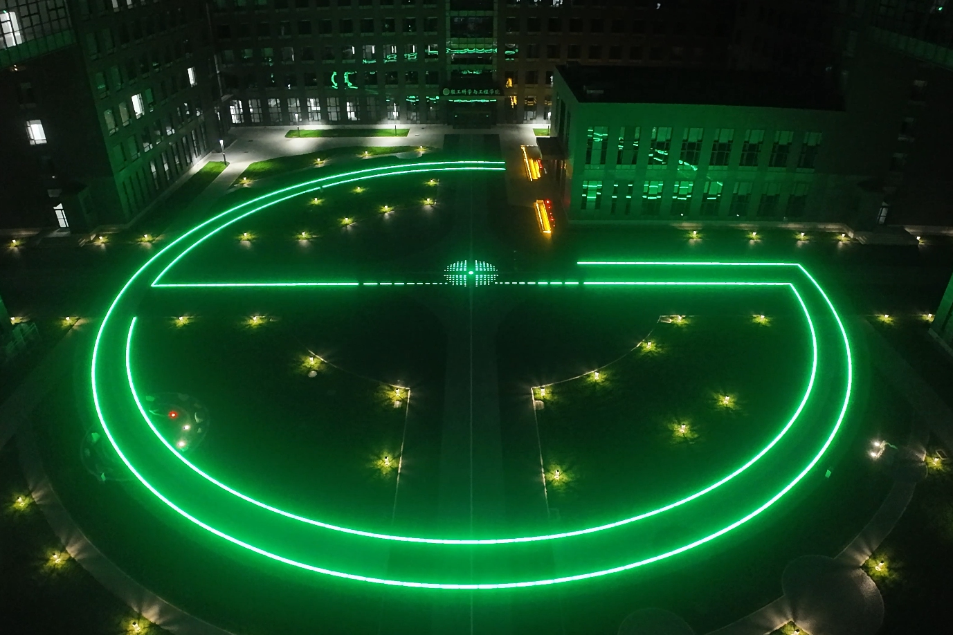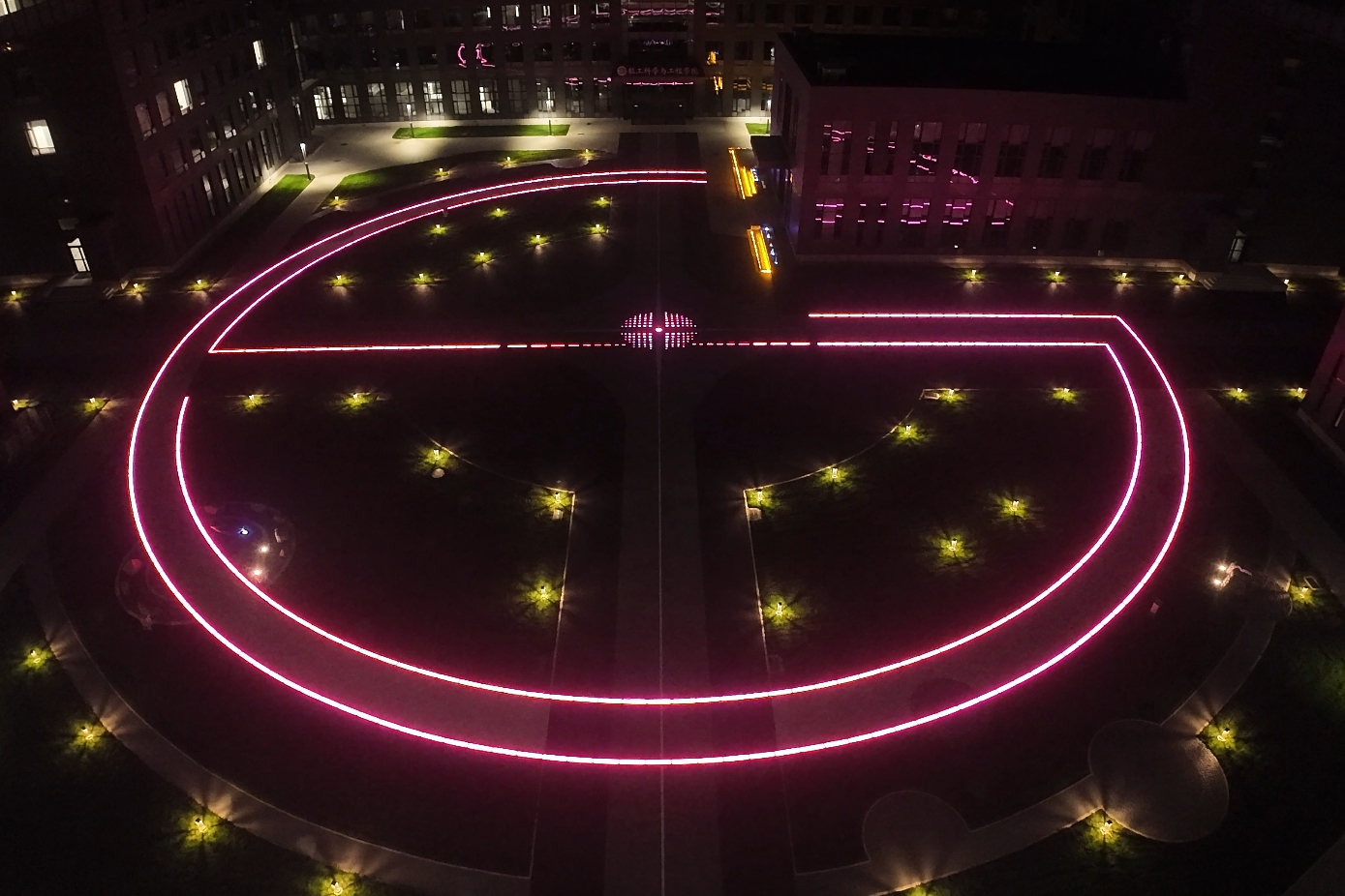 在节点设计上,庭院以“工商”的拼音大写首字母“GS”构成灯光景观,围绕环形辅路铺设。工商之环在夜晚指引着道路,让学生在科研结束后孤寂的夜也不再迷茫。