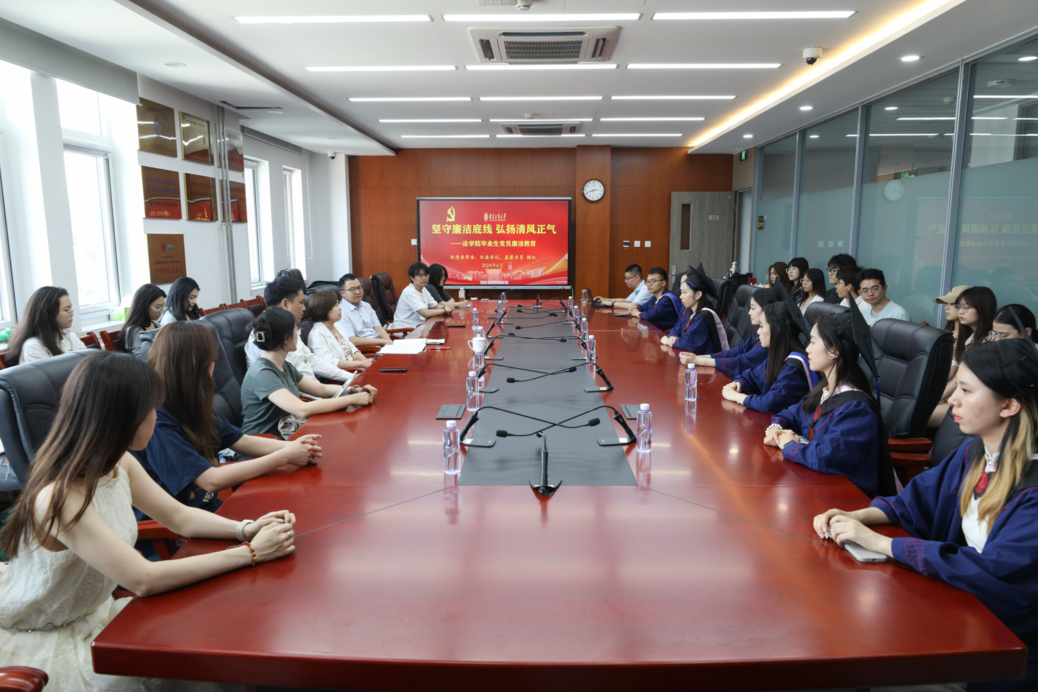 为做到学纪、知纪、明纪、守纪,进一步强化学生党员纪律意识、加强自我约束、增强政治定力、纪律定力、道德定力、抵腐定力,6月27日,学校党委常委、纪委书记、监察专员杨红来到法学院,以《坚守廉洁底线 弘扬清风正气》为主题讲授专题党课。法学院毕业生党员代表、在读学生党员、发展对象、积极分子共40余人参加学习。活动由法学院党委书记胥阳主持。