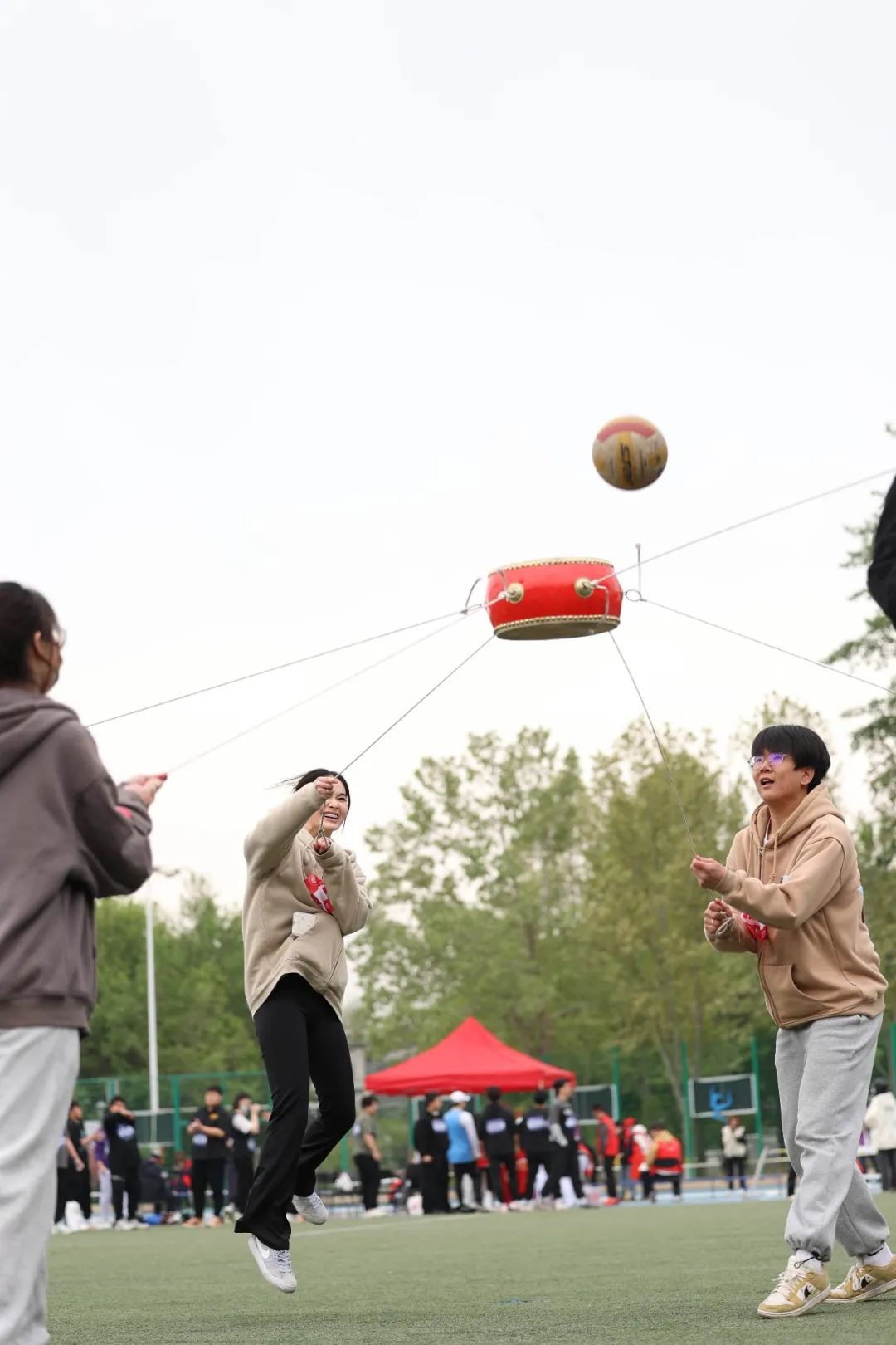 观众席上五彩斑斓,各学院院旗随风舞动,鼓声、口号声、呐喊声此起彼伏。啦啦队员们怀揣着集体荣誉感为运动员们加油助阵,运动场上洋溢着激情、文明、和谐的氛围。