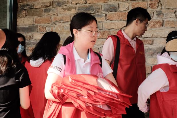 学生党员志愿者们无惧烈日,持续三个小时在炎热中用挺拔的身姿举起党旗,坚定着对党的忠诚;他们无惧酷暑,在热浪里组织开展一次又一次背篓交接仪式,让红色精神在一代代人之中传续;他们无惧劳累,不厌其烦地将百余件衣服整理、按尺码分类,准确无误地分发到每一个参观者的手中;他们不畏辛苦,跟随讲解员一次次走进展馆,引导每一个参观者完整体验学习参观流程,为游客答疑解惑。学生党员志愿者们用实际行动践行着红色背篓“坚决听党话、坚定跟党走、坚持为人民”的情怀与精神。