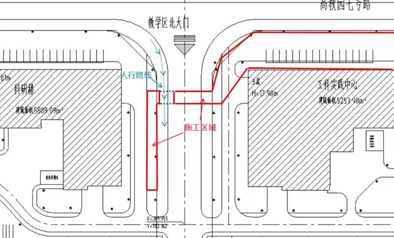 因施工需要,教学区北门机动车行通道封闭,班车将于教学区北门外停靠,请师生步行进入校区。机动车请绕行教学区西门进入(阳光南大街东侧)。请各位师生远离施工区域,注意安全,切勿进入围挡及警戒线以内,请勿在围挡附近停放车辆。由此给您带来的不便,敬请谅解!