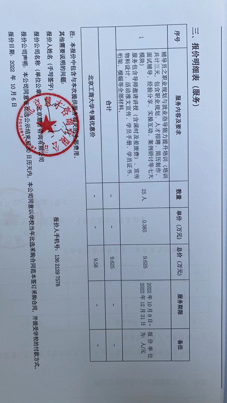 为了提升就业辅导员职业规划和就业指导能力,更好的进行就业相关工作,为毕业生提供更专业的咨询与辅导,招生就业处计划在本学期开展辅导员就业能力提升培训。通过市场调研发出询价,有3家公司提供了报价,经处务会研究,综合考虑培训内容服务、师资力量、性价比等因素,拟选北京慧才咨询有限公司作为本次采购单位。