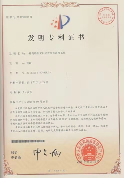 一是该系统的核心是唯一一套基于语料库和云计算技术的英语作文智能批改系统,其对英文文章进行192个维度的测量,再以地道的英美标准语料库作为标准,计算各个维度的测量值,最后根据一套人工智能算法进行计算,为学生提供实时的反馈,包括分数、评语以及逐词逐句的批改,该技术已获得国家知识产权局颁发的发明专利证书(证书号第1792037号,发明名称:一种英语作文自动评分方法及系统,专利号:ZL 2012 1 0049982.4)